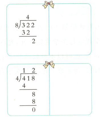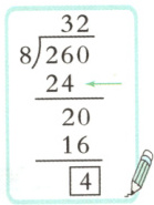 1. 蛋糕房准备做260个蛋挞,每盘最多烤8个,一共要烤多少盘?佳佳用右面竖式计算出了结果。