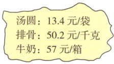 (5)李奶奶带100元钱去超市购物,她买了1袋汤圆和0.6千克排骨。剩下的钱还能购买一箱57元的牛奶吗?