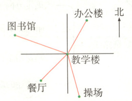 3. 如图是某所学校的简易平面示意图,以教学楼为观测点,用量角器量一量,并说一说操场、办公楼、图书馆、餐厅分别在教学楼的什么方向。