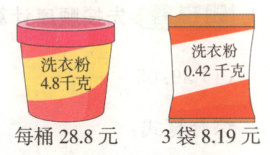 4.28.8÷4.8=6(元/千克) 8.19÷3÷0.42=6.5(元/千克) 6<6.5,桶装的洗衣粉合算。