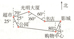 (2)李叔叔从影城出发,先向南偏西25°方向走到购物中心,再向北偏西80°方向走到公园,最后向北偏25°(此处可能原题有缺失假设为北偏东25°)方向走到超市。