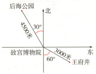 (4)先向正东方向前进1000米到达中国国家博物馆,再向北偏西20°方向前进1000米到达故宫博物院,再向北偏东20°方向前进2000米到达南锣鼓巷。