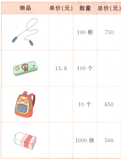 4. 应用意识 超市进了一些货物,请把进货单补充完整。
