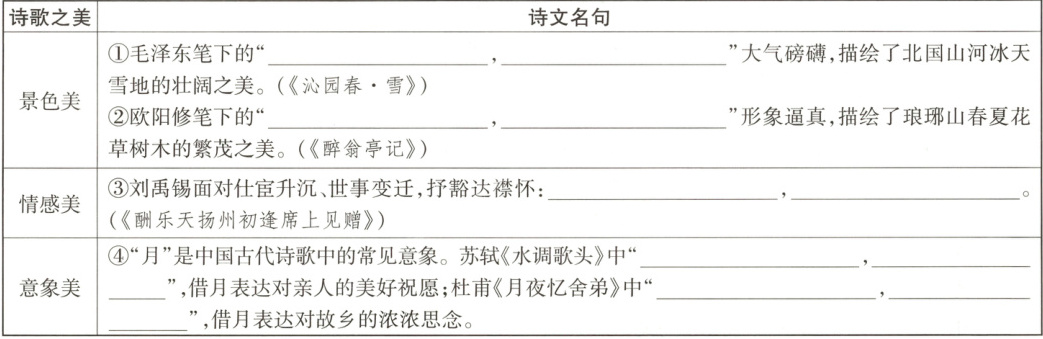 1. “诗者,志之所之也。在心为志,发言为诗。”诗歌以其独特的韵律和意境凝练了中国语言文字之美,是诗人内心情感与境界的外化。下面是以“诗歌之美”为主题的诗文名句积累卡,请你把其中空缺处的诗文名句书写在横线上。(10分)