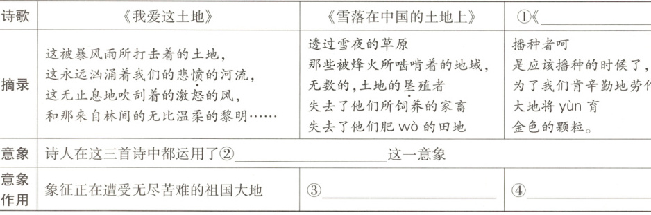 (3)(4分)①复活的土地 ②土地 ③象征遭受苦难的祖国大地和受难的民众 ④象征充满希望和新生的祖国