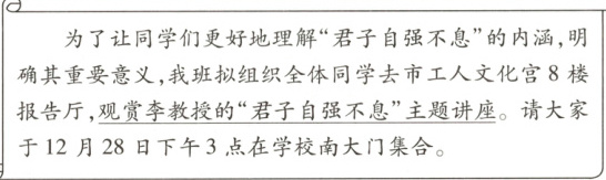 为了让同学们更好地理解“君子自强不息”的内涵,明确其重要意义,我班拟组织全体同学去市工人文化宫 8 楼报告厅,观赏李教授的“君子自强不息”主题讲座。请大家于 12 月 28 日下午 3 点在学校南大门集合。
