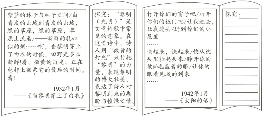 (4) 巧用意象是艾青诗歌的一大特色。请仿照《当黎明穿上了白衣》的探究示例,完成对《太阳的话》一诗的意象探究。(3 分)