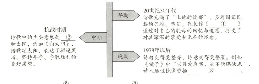 (3) 艾青的诗作可划分为三个阶段,请结合《艾青诗选》内容,完善思维导图。(3 分)