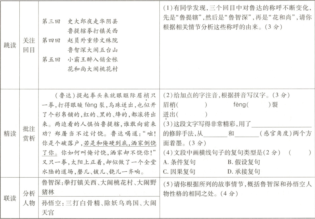 2. [新考法][勾联阅读]有同学以《水浒》和《西游记》为代表,在活动中与大家分享了自己阅读小说的方法,请你根据提示,完成表格中的(1)~(5)题。(15分)