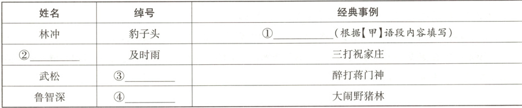 (3)林冲和武松是小说中浓墨重彩刻画的人物,都武艺高强,有勇有谋。作者在塑造这些人物时,也非常注意表现他们的个性。请结合【甲】【乙】两个语段,分析二人性格的不同之处。(4 分)