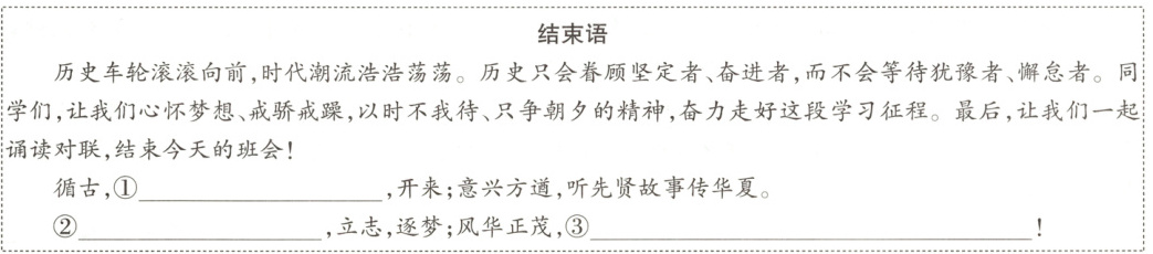 (5) 班会总结发言阶段,主持人希望在结束语中以对联的形式提出倡议,总结收获。请使用下面的词语和短语,补写对联。(3分)