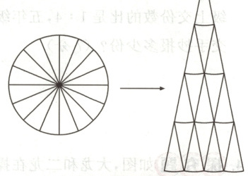 7. 探究题 圆面积公式的推导有不同的方法。王明把一个圆平均分成16份,得到16个大小相等的扇形,再把这些小扇形拼成一个近似的三角形(如图)。如果这个圆的半径用r表示,那么右面三角形的底可以表示为( ),高可以表示为( ),则三角形的面积是( ),由此得到圆的面积。