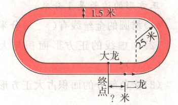 4. 探究题 如图,大龙和二龙在操场上赛跑,大龙沿内圈跑,二龙沿外圈跑,如果跑道宽是1.5米,二龙的起跑位置应该比大龙靠前多少米呢?想一想,外圈之所以比内圈路程远,是因为哪里路程长了呢?想明白了你会发现非常简便的算法哟。(6分)