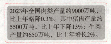 2023年全国肉类产量约9000万吨,比上年略降0.3%。其中猪肉产量约5500万吨,比上年下降13%;牛肉产量约650万吨,比上年增长2%。
