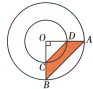解析:阴影部分的面积等于大直角三角形ABO的面积减去小直角三角形CDO的面积,大直角三角形的底和高即为大圆的半径,小直角三角形的底和高即为小圆的半径,所以阴影部分的面积即为$(R^{2}-r^{2})÷2,$据此用3.14乘$(R^{2}-r^{2})$即可得出圆环的面积。