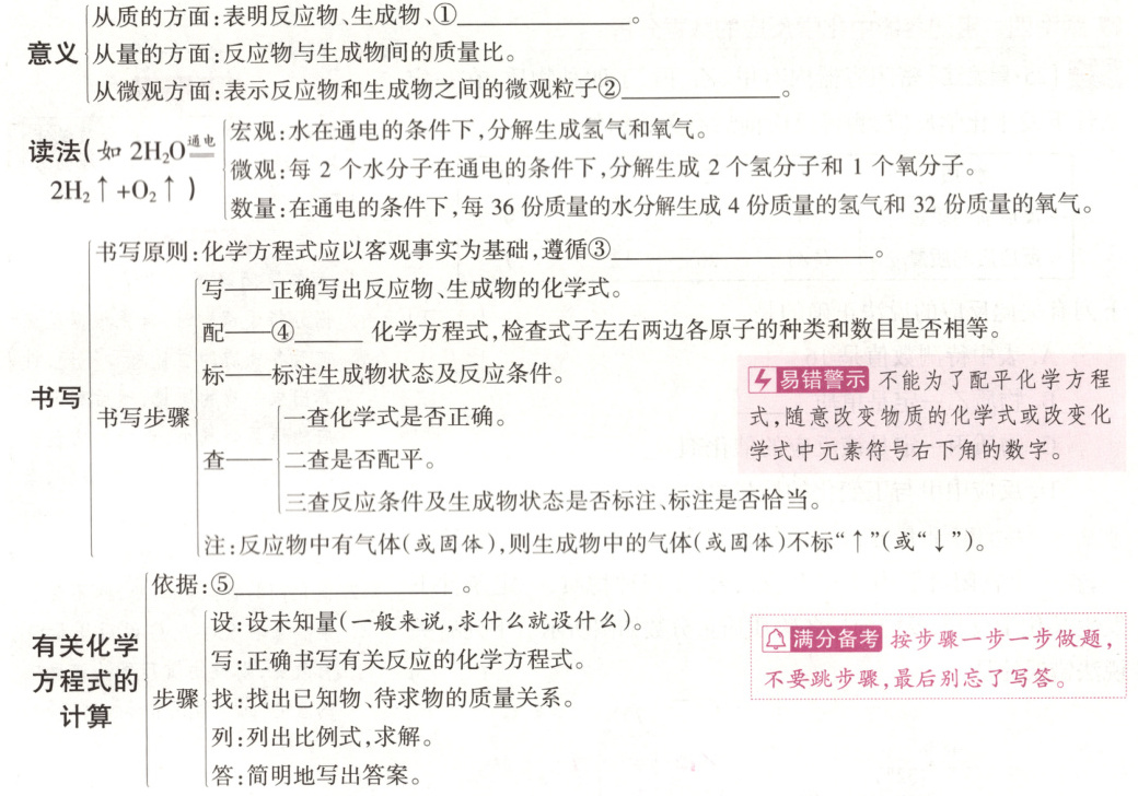 ①反应条件;②个数比;③质量守恒定律;④配平;⑤质量守恒定律