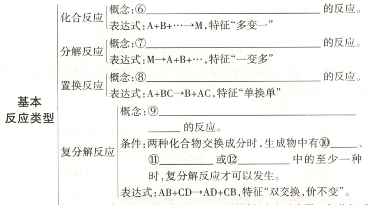 ⑥由两种或两种以上物质生成另一种物质;⑦由一种反应物生成两种或两种以上其他物质;⑧由一种单质与一种化合物反应生成另一种单质和另一种化合物;⑨由两种化合物互相交换成分生成另外两种化合物;⑩沉淀;⑪气体;⑫水;即学即练:①化合反应;②分解反应;③置换反应;④复分解反应