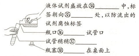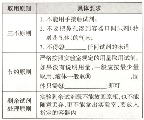 1. 取用原则:29. 尝;30. 1~2mL;31. 铺满试管底部