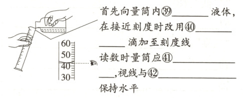 3. 液体试剂的取用:34. 细口瓶;35. 手心;36. 紧挨;37. 倾斜;38. 倒放;39. 倾倒;40. 胶头滴管;41. 平放在实验桌上;42. 液体凹液面的最低处;43. 胶头滴管;44. 正上方;45. 伸入;46. 清洗