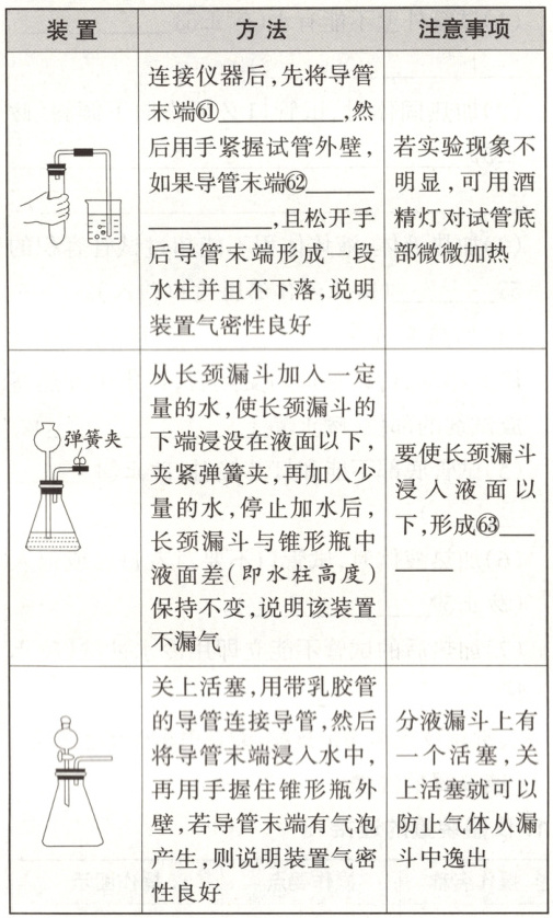 三、常用仪器装置的连接、装置气密性的检查及玻璃仪器的洗涤:61. 浸入水中;62. 有气泡产生;63. 液封;64. 既不聚成水滴,也不成股流下