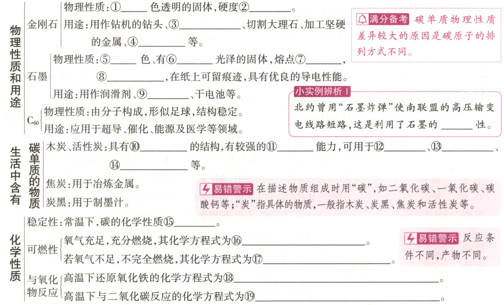 ①无 ②大 ③裁玻璃 ④作装饰品 ⑤灰黑 ⑥金属 ⑦高 ⑧很软 ⑨铅笔芯 ⑩疏松多孔 ⑪吸附 ⑫防毒面具 ⑬去除异味 ⑭吸附 色素 ⑮稳定 ⑯$\text{C+O}_2\stackrel{点燃}{=\!=\!=}\text{CO}_2$ ⑰$2\text{C+O}_2\stackrel{点燃}{=\!=\!=}2\text{CO}$ ⑱$3\text{C+2Fe}_2\text{O}_3\stackrel{高温}{=\!=\!=}4\text{Fe+3CO}_2\uparrow$ ⑲$\text{C+CO}_2\stackrel{高温}{=\!=\!=}2\text{CO}$