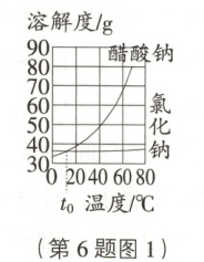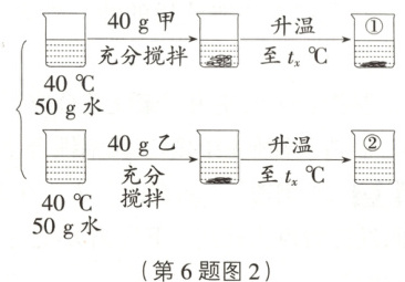 6.C 提示:由题图2可知,40℃时,向50g水中分别加入40g甲和乙,充分搅拌,均有固体未溶解,且乙比甲溶解的多,说明40℃时,乙的溶解度比甲大,则甲是氯化钠,乙是醋酸钠。升温至$t_{x}$℃,40g甲固体部分溶解,40g乙完全溶解,说明$t_{x}$℃时,乙(醋酸钠)的溶解度≥80g,题图1中60℃时,醋酸钠的溶解度小于80g,则$t_{x}$不可能等于60,故C项错误。