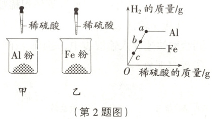 2. D 提示:$a$点时,甲烧杯中的酸恰好完全反应,乙烧杯中的酸有剩余,故A项错误;由题图可知,$b$点时,铁粉早已反应完,两个烧杯中产生氢气的质量不相同,故B项错误;$c$点之后,两个烧杯都能继续产生氢气,则$c$点时两个烧杯中都有金属剩余,故C项错误。