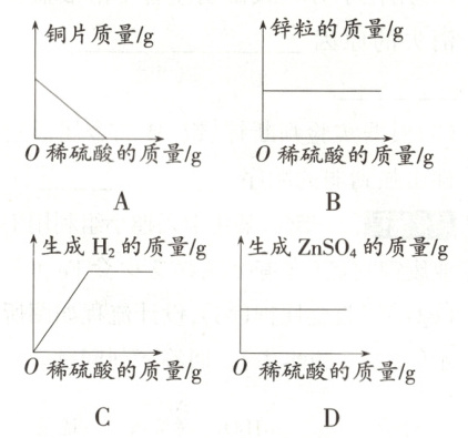 4. C 提示:铜与稀硫酸不反应,随着稀硫酸的加入,铜片的质量不变,故A项错误;锌和稀硫酸反应生成硫酸锌和氢气,随着稀硫酸的加入,锌粒不断减少直至为0,故B项错误;锌和稀硫酸反应生成硫酸锌和氢气,随着稀硫酸的不断加入,硫酸锌的质量从0开始不断增加,当锌完全消耗后,硫酸锌的质量不再变,故D项错误。