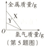5. C 提示:由题图可知,加入的金属的质量:$X>Y$,故A项错误;由于该图坐标没有表示时间的,则无法比较金属的活动性强弱,故B项错误;由题图可知,生成的氢气的质量相同,说明消耗的酸的质量相同,根据质量守恒定律,由于消耗的金属质量$X>Y$,则最终所得溶液的质量$X>Y$,故D项错误。