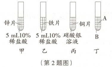 (2)甲实验中锌能置换稀盐酸中的氢,说明锌的金属活动性大于氢,乙实验中铁与盐酸反应,说明铁排在氢的前面,甲中产生气泡的速率比乙中快,说明锌比铁活泼,且二者都排在氢前,丙实验中铜与硝酸银反应,说明铜的金属活动性大于银,甲、乙、丙三个实验,无法比较铁与铜的金属活动性强弱,若题图丁中的溶液B是稀盐酸,则固体A为铜,铜与稀盐酸不反应,说明铜的金属活动性小于氢,则可证明铁比铜活泼,由此可得出四种金属活动性为锌>铁>铜>银。