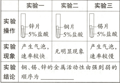 5.【实验记录与分析】锌>锡>铜(或$\mathrm{Zn>Sn>Cu}$) 【反思评价】锌片、铜片和$\mathrm{SnCl_2}$溶液(或锡片、$\mathrm{ZnCl_2}$溶液、$\mathrm{CuCl_2}$溶液) 【拓展应用】锡能与醋酸发生反应