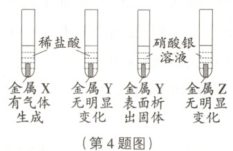 4.A 提示:现有X、Y、Z三种金属,把X和Y分别放入稀盐酸中,X产生氢气,Y不反应,说明X的金属活动性比氢强,Y的金属活动性比氢弱,即X>H>Y;把Y和Z分别放入硝酸银溶液中,过一会儿,在Y表面有银析出,而Z没有变化,说明Y的金属活动性比银强,Z的金属活动性比银弱,即Y>Ag>Z;则X、Y和Z的金属活动性顺序为X>Y>Z。