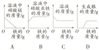 3.D 提示:由$Zn + 2AgNO_3 \xlongequal\ Zn(NO_3)_2 + 2Ag$可知,每65份质量的锌可置换出216份质量的银;由$Fe + 2AgNO_3 \xlongequal\ Fe(NO_3)_2 + 2Ag$可知,每56份质量的铁可置换出216份质量的银,只有锌参加反应或锌、铁都参加反应,反应后滤渣的质量一定增大,故D项错误。