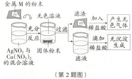 2.D 提示:将金属M的粉末放入$AgNO_3$和$Cu(NO_3)_2$的混合溶液中,硝酸铜溶液呈蓝色,反应后得到无色溶液和固体粉末,说明金属M已置换出$Cu(NO_3)_2$中的铜,而银的金属活动性比铜弱,则M要先和$AgNO_3$反应,等$AgNO_3$反应完后再和$Cu(NO_3)_2$反应,过滤后向滤渣中加入稀盐酸,产生无色气体,说明金属M过量,且$M>H$,则$AgNO_3$和$Cu(NO_3)_2$都完全反应;向滤液中滴加稀盐酸无沉淀生成,再次验证硝酸银已经完全反应。加入M后得到无色溶液,则金属M不可能是单质铁,故D项错误。