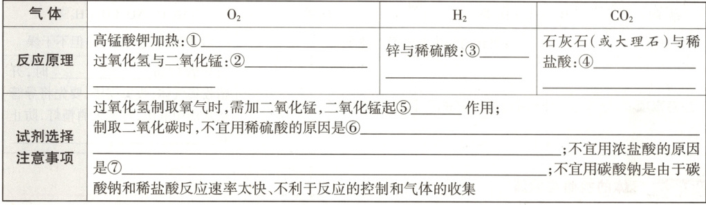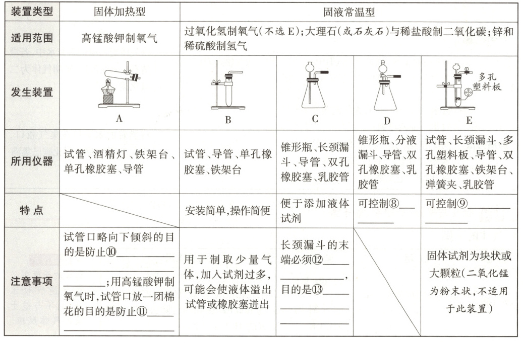 ⑧反应速率;⑨反应的发生与停止;⑩冷凝水回流到热的试管底部,使试管炸裂;⑪高锰酸钾粉末进入导管;⑫伸入液面以下;⑬防止生成的气体从长颈漏斗逸出