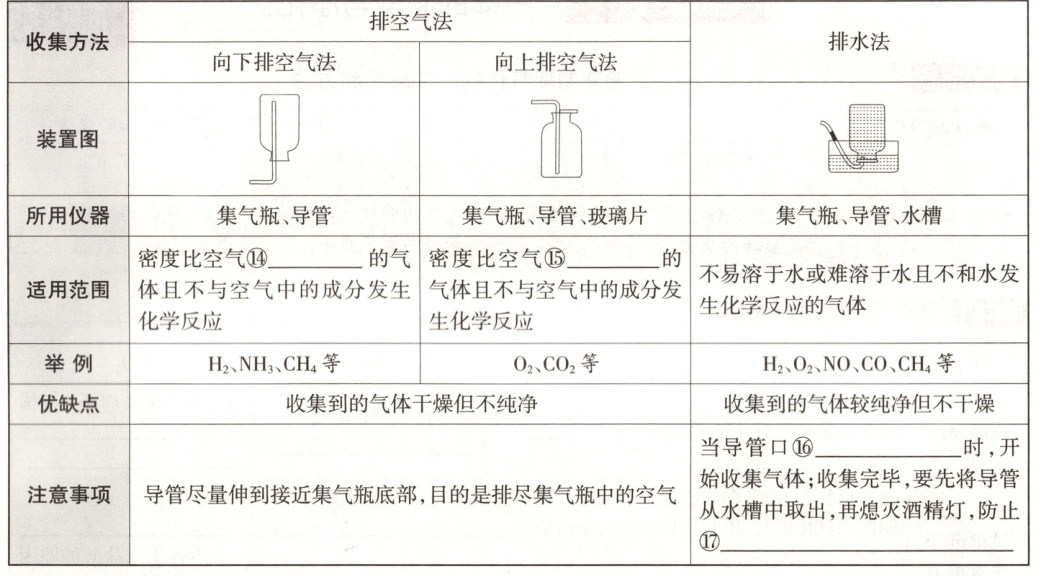 2. 收集装置的选择(依据为气体的密度、溶解性、是否与水反应等)