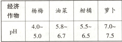 6. 跨学科实践 某研学小组进入柑橘园劳动。农技人员介绍,柑橘的产量和品质受到肥效和土壤酸碱性等因素的影响。研学小组测得某处土壤 pH=4,说明该土壤呈