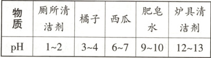 10.C 提示:西瓜的pH为6~7,呈酸性或中性,肥皂水、炉具清洁剂的pH大于7,显碱性,故A项错误;橘子的pH小于7,显酸性,因此胃酸过多的人不宜多食用橘子,故B项错误;厕所清洁剂的pH小于7,炉具清洁剂的pH大于7,能发生反应,厕所清洁剂与炉具清洁剂不能混合使用,故D项错误。