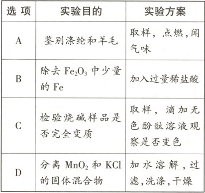 6.A 提示:$Fe$、$Fe_2O_3$均能与过量稀盐酸反应,不但能把杂质除去,也会把原物质除去,不符合除杂原则,故B项实验方案不能达到实验目的;氢氧化钠变质会生成碳酸钠,碳酸钠、氢氧化钠均显碱性,均能使无色酚酞溶液变红色,不能检验烧碱样品是否完全变质,故C项实验方案不能达到实验目的;$KCl$易溶于水,$MnO_2$难溶于水,加水溶解,过滤,洗涤,干燥,能分离出二氧化锰,应再蒸发结晶分离出氯化钾,故D项实验方案不能达到实验目的。