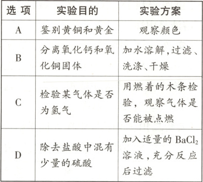 5.D 提示:黄铜和黄金均为金黄色固体,用观察颜色的方法不能鉴别,故A项实验方案设计不可行;加水溶解,氧化钙能与水反应生成氢氧化钙,氧化铜难溶于水,过滤、洗涤、干燥,能分离出氧化铜,无法分离出氧化钙,故B项实验方案设计不可行;用燃着的木条检验,观察气体是否能被点燃,不能检验某气体是否为氢气,也可能是一氧化碳、甲烷等气体,故C项实验方案设计不可行。