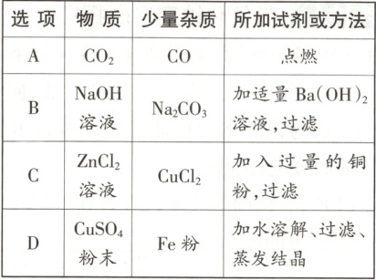 4.B 提示:除去二氧化碳中的少量一氧化碳不能用点燃的方法,这是因为当二氧化碳(不能燃烧、不能支持燃烧)大量存在时,少量的一氧化碳不会被点燃,故A项错误;过量的铜粉不能与 $CuCl_2$溶液反应,不能除去杂质,故C项错误;加水溶解后,$Fe$与 $CuSO_4$反应生成 $FeSO_4$和 $Cu$,不但能把杂质除去,还会把原物质除去,不符合除杂原则,故D项错误。