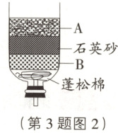 (选填“A”或“B”)。其中,塑料瓶中填充的小卵石和石英砂的主要作用是除去不溶物(或难溶物)