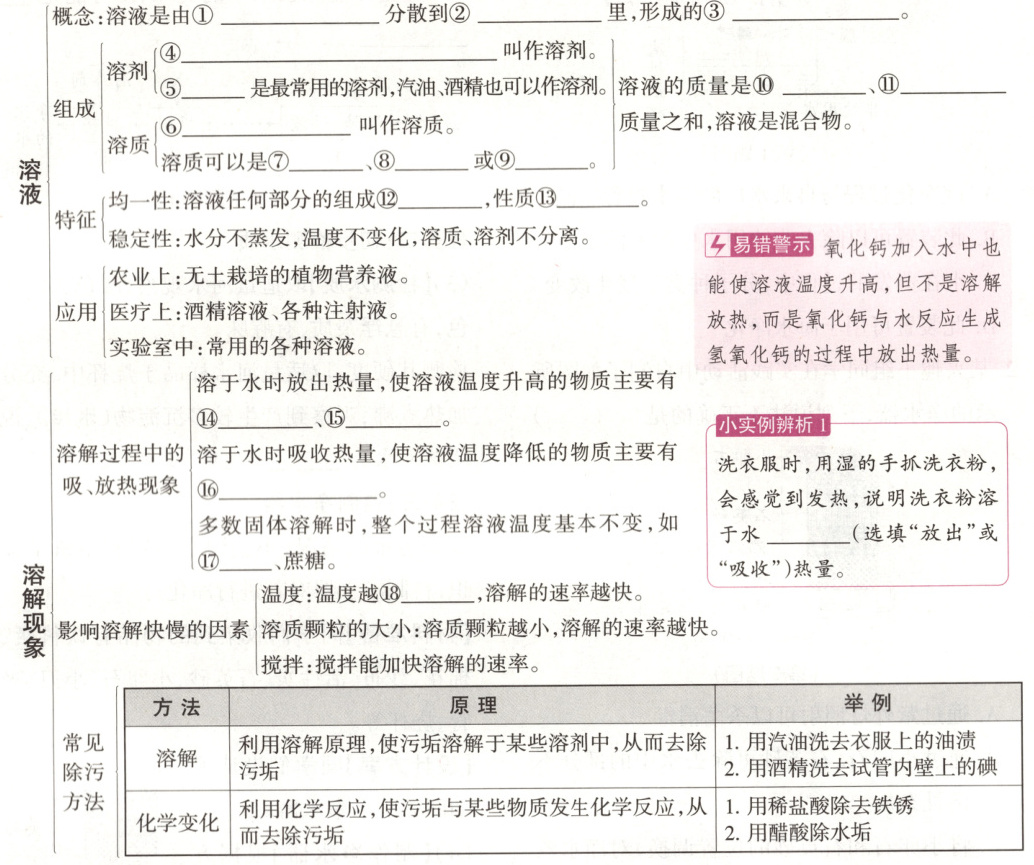 ①一种或几种物质 ②另一种物质③均一、稳定的混合物④能溶解其他物质的物质 ⑤水⑥被溶解的物质 ⑦固体 ⑧液体⑨气体 ⑫相同⑬相同 ⑭浓硫酸 ⑮氢氧化钠⑯硝酸铵 ⑰氯化钠 ⑱高小实例辨析1放出