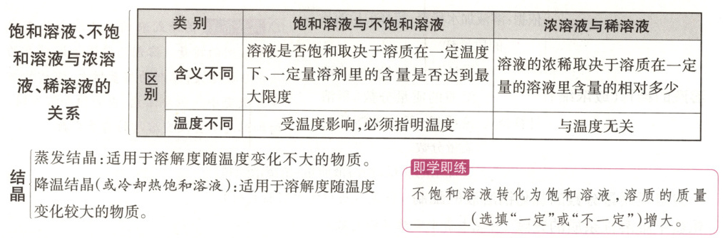 ⑲温度⑳不能 ㉑能 ㉒不饱和溶液㉓饱和溶液即学即练不一定
