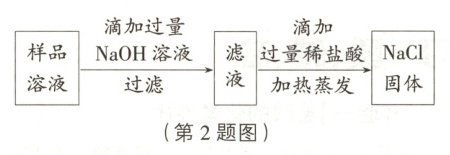 (2)滴加过量的氢氧化钠,氢氧化钠和氯化镁反应生成氢氧化镁沉淀和氯化钠,过滤可除去氢氧化镁,滤液中溶质为氯化钠和过量氢氧化钠,加入过量稀盐酸后,氯化氢与氢氧化钠反应生成氯化钠和水,过量的稀盐酸可完全除去氢氧化钠,盐酸具有挥发性,蒸发过程中,氯化氢会挥发出去,从而得到氯化钠固体,故加入过量稀盐酸的目的是除去过量的氢氧化钠。