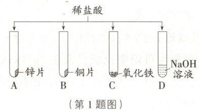 (1)A试管中锌能与稀盐酸反应生成氢气,有气泡产生,B试管中铜不能与稀盐酸反应,无明显现象,C试管中氧化铁和稀盐酸反应生成氯化铁和水,观察到固体溶解,溶液变成黄色,D试管中稀盐酸和氢氧化钠反应生成氯化钠和水,无明显现象,则有气泡产生的是A。