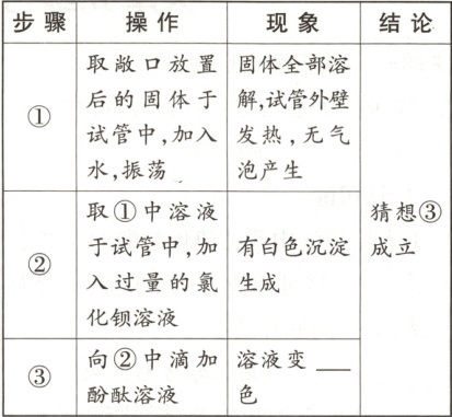 (5)取敞口放置后的固体于试管中,加入水,振荡,固体全部溶解,试管外壁发热,无气泡产生,说明固体中不含有过氧化钠;取①中溶液于试管中,加入过量的氯化钡溶液,产生白色沉淀,碳酸钠和氯化钡反应生成了白色沉淀碳酸钡和氯化钠,说明溶液中存在碳酸钠;向②中滴加酚酞溶液,溶液变红色,说明溶液中含有氢氧化钠;从而说明猜想③成立。