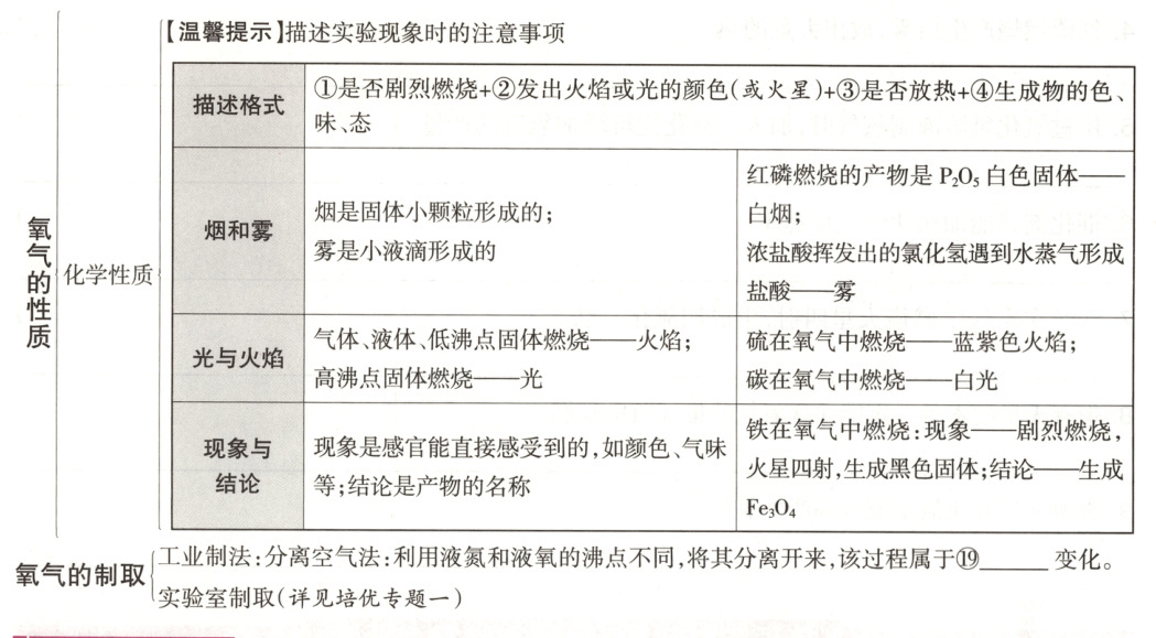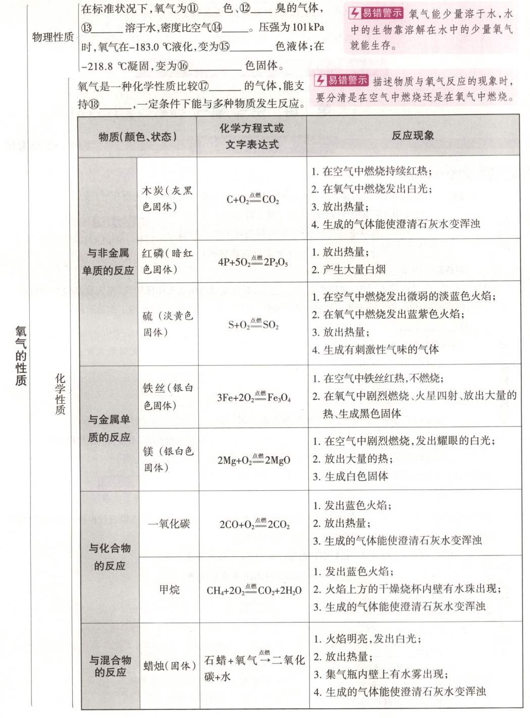 ⑪无 ⑫无 ⑬不易 ⑭略大 ⑮淡蓝 ⑯淡蓝 ⑰活泼 ⑱燃烧 ⑲物理 化学方程式书写$ ①2KMnO₄\stackrel{△}{=}K₂MnO₄+MnO₂+O₂↑ ②2H₂O₂\stackrel{MnO₂}{=}2H₂O+O₂↑ ③CH₄+2O₂\stackrel{点燃}{=}CO₂+2H₂O ④C₂H₅OH+3O₂\stackrel{点燃}{=}2CO₂+3H₂O ⑤2Cu+O₂\stackrel{△}{=}2CuO ⑥3Fe+2O₂\stackrel{点燃}{=}Fe₃O₄ ⑦4Al+3O₂=2Al₂O₃ ⑧2Mg+O₂\stackrel{点燃}{=}2MgO ⑨2H₂+O₂\stackrel{点燃}{=}2H₂O ⑩4P+5O₂\stackrel{点燃}{=}2P₂O₅ ⑪C+O₂\stackrel{点燃}{=}CO₂($合理即可$) ⑫2C+O₂\stackrel{点燃}{=}2CO ⑬S+O₂\stackrel{点燃}{=}SO₂ ⑭2H₂O\stackrel{通电}{=}2H₂↑+O₂↑$