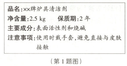 _。② 厨房中的炉具清洁剂可用于清洗抽油烟机等油污重灾区。某品牌的炉具清洁剂的说明书如图所示。写出烧碱的化学式:_,使用炉具清洁剂时需要戴胶皮手套,原因是