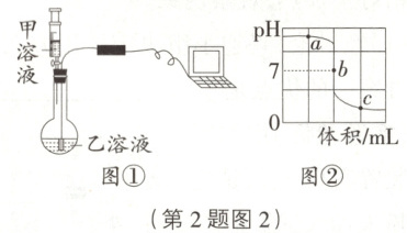 _;图②中 c 点所示溶液中的溶质是$NaCl$、$HCl$